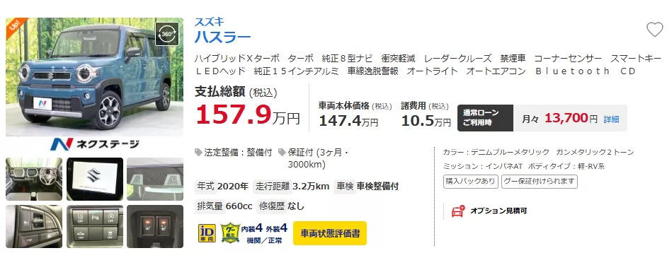 例えばハスラー(スズキ)の走行距離3万キロの場合、160万円くらいが相場です。一方で、新車は標準的な構成で200万くらいになります。